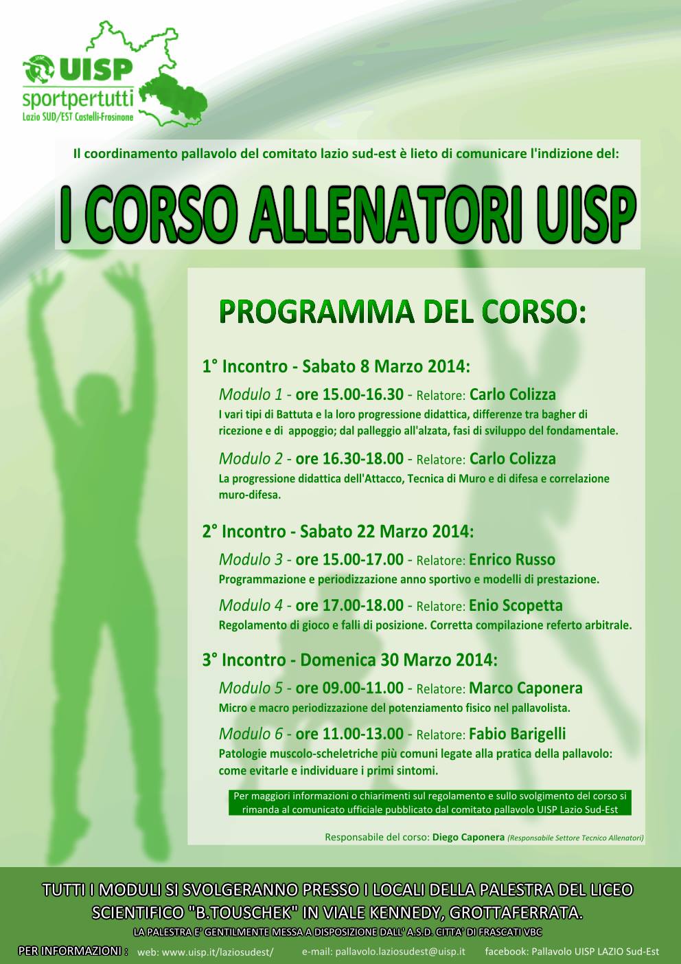 A partire da sabato 8 Marzo presso la Palestra annessa al Liceo Scientifico “Touschek” di Grottaferrata, viale Kennedy, si terrà il primo corso per allenatori di pallavolo del Comitato UISP Lazio Sud Est. Il corso eÌ€ curato da Diego Caponera, e segue scrupolosamente le indicazioni della Lega Nazionale Pallavolo UISP. Per ulteriori informazioni o preannuncio di iscrizioni utilizzare i seguenti contatti:
