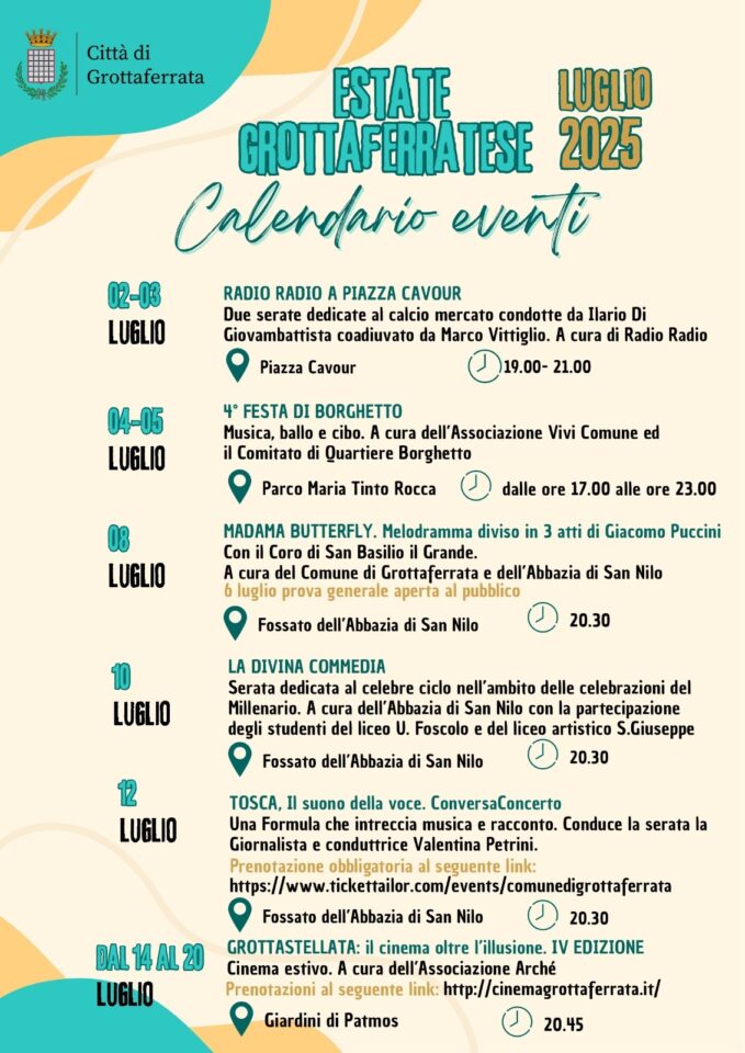 «L’Amministrazione comunale è lieta di presentare il cartellone di grandi iniziative estive pensate per il mese di luglio 2025 in collaborazione con tante associazioni, comitati e istituzioni di grande rilevanza – dichiara il Sindaco Mirko Di Bernardo -. Gli eventi sono stati pensati per coinvolgere tutti, grandi e piccini, e per far diventare Grottaferrata un punto di riferimento estivo sostenendo allo stesso tempo le nostre attività attraverso l’indotto che può creare il turismo di prossimità. A questo cartellone seguirà quello di agosto, per un’estate all’insegna della cultura, della musica, del cinema e per fare comunità, stare insieme e scoprire la bellezza di tanti luoghi storici, centrali e periferici. Ringrazio la Giunta comunale per aver accolto e promosso il Calendario degli eventi e la Consigliera Veronica Pavani, Presidente della Commissione cultura, per aver lavorato al programma di iniziative».
