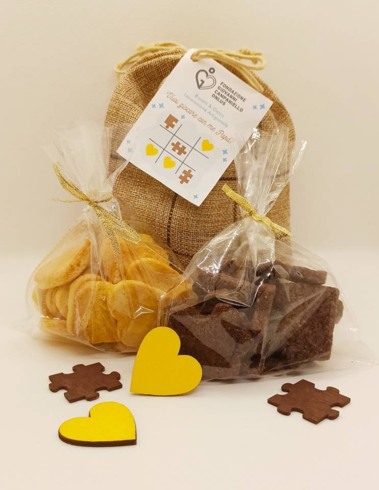 Contiene due diversi tipi di pedine. Ci sono quelle di legno, decorate a mano dai ragazzi con cura, e quelle di biscotto, preparate sempre da loro durante il laboratorio di cucina, una delle attività svolte in Fondazione.