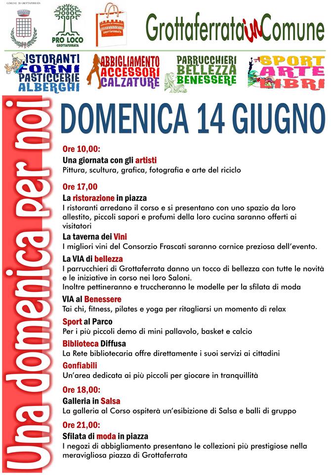 Domenica 14 giugno la Città di Grottaferrata si anima con “Grottaferrata in Comune”, la manifestazione organizzata dall’Amministrazione comunale con la Pro Loco Grottaferrata e l’Associazione dei Commercianti di Grottaferrata ed in collaborazione con le diverse Attività ed Associazioni del territorio, in programma a partire dalle ore 10.00 e fino alla sera, in Piazza de Gasperi, Corso del Popolo, Piazza Cavour, Via Domenichino, via Gregorio di Tuscolo e nel Parco Traiano. Le attività commerciali, artigianali, di ristorazione e sportive di Grottaferrata si mettono in mostra con esposizioni, degustazioni, dimostrazioni, animazione, musica ed eventi di moda, attraverso un percorso che attraverserà il cuore della Città e che allieterà tutti i visitatori donando loro un ambiente elegante e romantico.