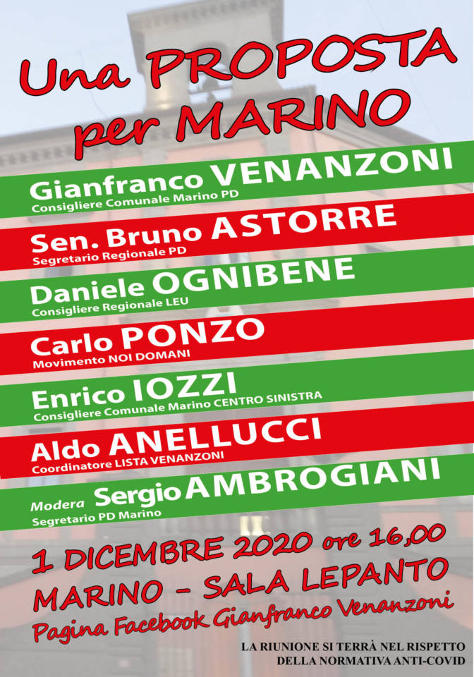 “Una proposta per Marino” con Gianfranco Venanzoni sindaco, questo il titolo della conferenza programmatica organizzata dal Partito Democratico marinese in vista delle elezioni amministrative della prossima primavera. Il meeting si terrà martedì 1 dicembre alle ore 16, presso la Sala Lepanto, in totale assenza di pubblico, e sarà trasmesso in diretta Facebook sul profilo di Gianfranco Venanzoni.