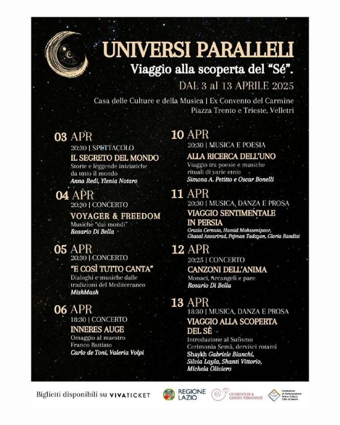 Un programma intenso, variegato e di assoluta qualità per una rassegna ambiziosa e di sicuro interesse culturale. Tutti gli spettacoli si svolgeranno nell’Auditorium “Romina Trenta”, alla Casa delle Culture e della Musica di Velletri, e i biglietti sono acquistabili su VivaTicket al link: https://www.vivaticket.com/it/ tour/universi-paralleli/4094. L’intento di questo progetto è quello di valorizzare e far meglio conoscere, raggiungendo il grande pubblico e le giovani generazioni, i contenuti che trasmettano valori alti esploranti le tradizioni mistiche orientali e occidentali per divenire eclettismo come essenza innovativa in un percorso formativo e di miglioramento della qualità umana.