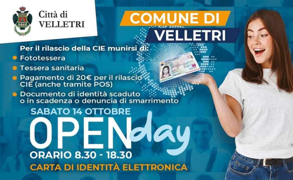 Il comune di Velletri ha fissato per sabato 14 ottobre dalle 08.30 alle 18,30 una giomata dedicata a chi necessita di una nuova carta d’identità elettronica. Per il rilascio della CIE sono necessari: fototes sera, tessera sanitaria, pagamento di 20€ per il rilascio CIE (anche tramite POS), documento d’identità scaduto, o in scadenza o relativa denuncia di smarrimento/furto.