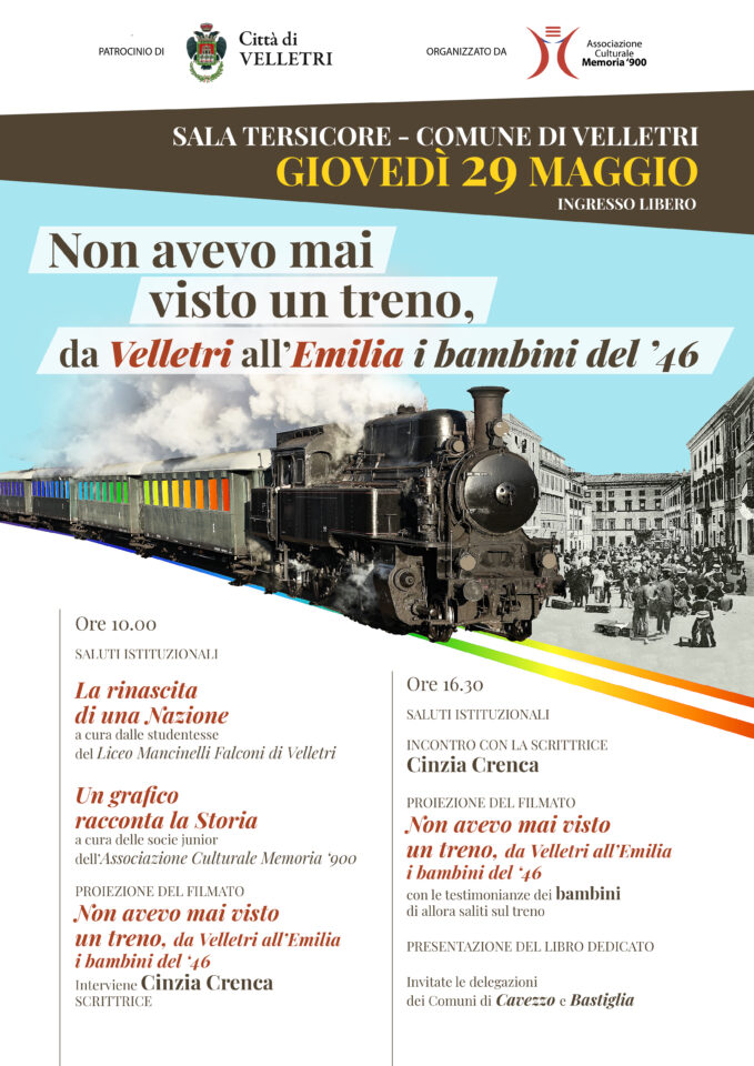 Giovedì 29 maggio, alle ore 10, dopo i saluti istituzionali la Sala Tersicore ospiterà la presentazione del progetto e del lavoro “La rinascita di una Nazione”, a cura dalle studentesse del Liceo Mancinelli Falconi di Velletri (nell’ambito delle attività di PCTO). A seguire, sarà presentato il lavoro “Un grafico racconta la Storia”, a cura delle socie junior dell’Associazione Culturale Memoria ‘900. Infine verrà proiettato il filmato con le interviste ai bambini, oggi uomini anziani ma fermi nel loro ricordo, “Non avevo mai visto un treno, da Velletri all’Emilia i bambini del ‘46”. Interverranno gli studenti e le studentesse delle scuole primarie e secondarie di primo e secondo grado di Velletri e sarà ospite la scrittrice Cinzia Crenca, autrice del libro “Il treno della felicità: l’avventura di Remo e Romano”.