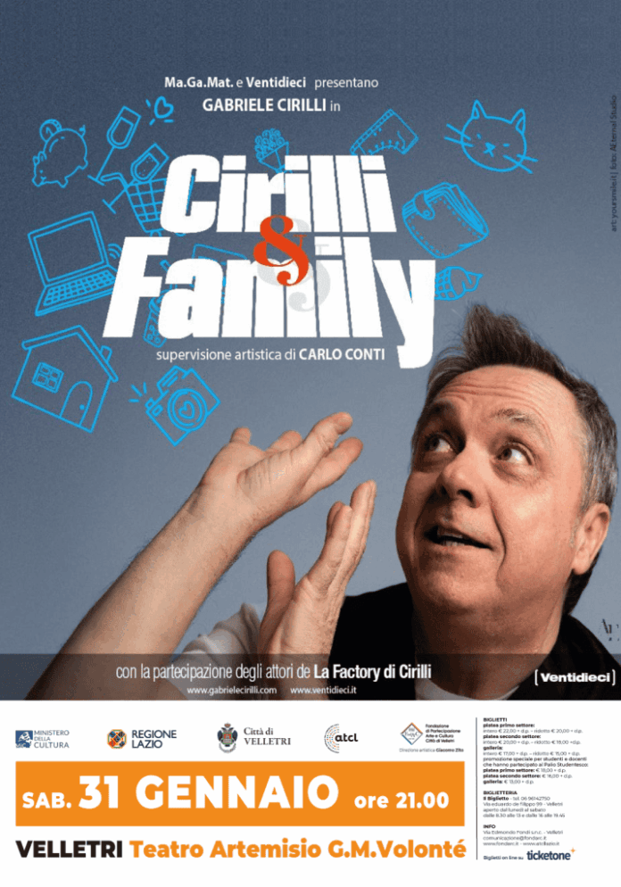 Sabato 31 gennaio 2026 alle ore 21 Gabriele Cirilli si esibirà in “Cirilli & Family”, testo da lui ideato con la supervisione artistica Carlo Conti, e sul palco gli attori de La Factory, scuola di teatro ideata dall’artista abruzzese. Sarà l’occasione per raccontare virtù e divertimenti dell’universo famiglia: partendo dalla sua, portando il pubblico a riconoscersi e diventarne parte. Questo è il messaggio che Gabriele vuole lanciare: se le persone sono disposte ad avvicinarsi e a lottare insieme con un comune denominatore, l’amore, allora una semplice “squadra” diventerà qualcosa di più: come si dice oggi un “Upgrade”, o come si è sempre detto, una “Family”.