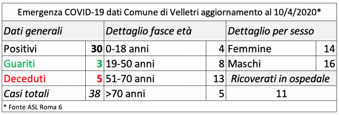 Dalle comunicazioni ufficiali della ASL riceviamo la triste notizia del decesso di Rolando Maggiore di 82 anni che risiedeva presso Villa delle Querce a Nemi, alla famiglia esprimo le condoglianze di tutta la Città di Velletri. Per contro la notizia positiva del quotidiano bollettino sanitario è la guarigione di due ragazzi. Il riepilogo lo abbiamo sintetizzato in una tabella che quotidianamente pubblicheremo sul diario.