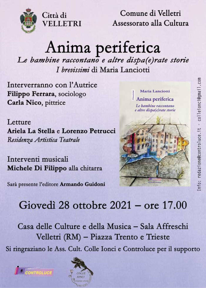 Velletri. Presentazione con la scrittrice Maria Lanciotti patrocinato dal Comune guidato da Orlando Pocci e dall’Assessorato alla Cultura del Comune veliterno del libro Anima periferica – le bambine raccontano e altre dispa(e)rate storie. I brevissimi di Maria Lanciotti. Appuntamento giovedì 28 ottobre dalle ore 17 presso la Casa delle Culture e della Musica di Velletri