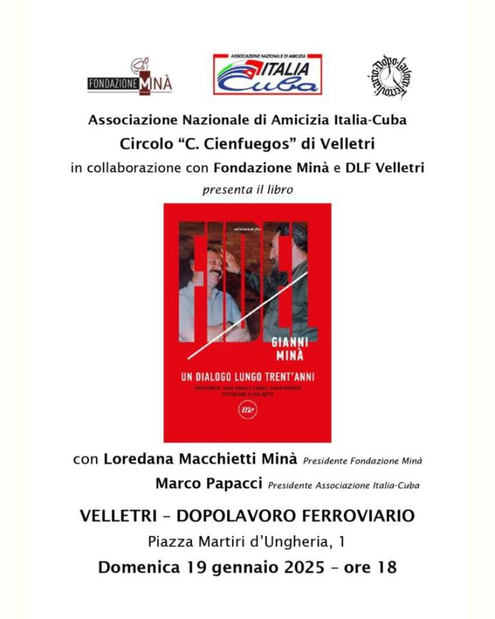 L’Associazione Nazionale di Amicizia Italia-Cuba Circolo di Velletri “Camilo Cienfuegos” in collaborazione con la Fondazione Minà e il Dopolavoro Ferroviario presentano l’incontro con Loredana Macchietti Minà, moglie del compianto giornalista, scrittore e autore televisivo Gianni, per parlare del suo libro “Un dialogo lungo trent’anni”. Interverranno, oltre a Loredana Macchietti Minà, anche in qualità di presidente della Fondazione, Marco Papacci, presidente nazionale dell’Associazione di Amicizia Italia-Cuba.