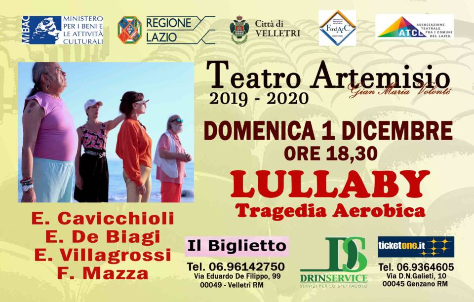 Primo giorno di dicembre al Teatro Artemisio-Volonté con la “tragedia aerobica” “Lullaby”. Uno spettacolo ambientato negli Stati Uniti d’Europa del 2059, dove i giovani del 2019 si godono la loro meritata vecchiaia nei centri “Lullaby”. Improvvisamente, però, qualcosa cambia e c’è un colpo di scena che farà totalmente mutare la prospettiva e il punto di vista. Nuova data in calendario per il Teatro Comunale, diretto dal Maestro Claudio Maria Micheli. Domenica primo dicembre alle ore 18.30 si torna in sala per questo spettacolo interessante e divertente, inserito nel cartellone 2019-2020. È attiva la prevendita presso Drin Service a Genzano (Via Galieti, 10), Il Biglietto a Velletri (Via De Filippo, 99) e on line su ticketone.it.