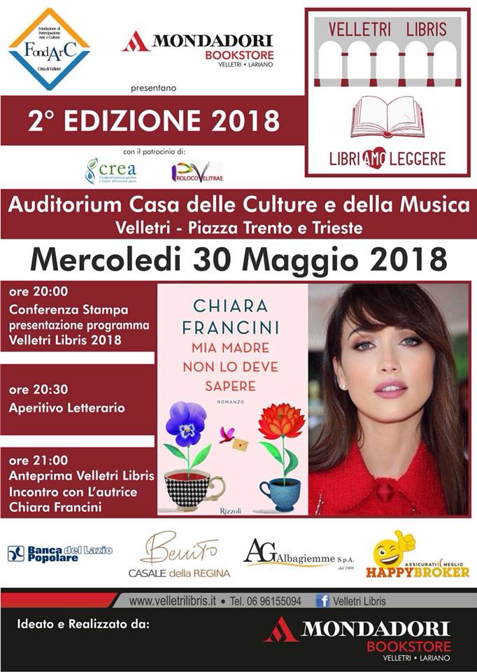 La conferenza/inaugurazione ufficiale della rassegna internazionale di letteratura “Velletri Libris” sarà ospitata nello splendido Auditorium della Casa delle Culture e della Musica di Velletri, mercoledì 30 maggio 2018 a partire dalle ore 20.00, inizierà ufficialmente con una serata-evento l’edizione 2018 dell’appuntamento estivo con i libri e con la letteratura. La rassegna, ideata e realizzata dalla Libreria Mondadori Bookstore Velletri-Lariano in co-produzione con la Fondazione di Partecipazione Arte & Cultura Città di Velletri, si pone come un viaggio – che coinvolge l’intero territorio, a partire dal centro veliterno – fra libri, letture, incontri, riflessioni. Alle ore 20.00 si svolgerà la conferenza stampa in cui verrà illustrata la programmazione completa degli appuntamenti, poi seguirà un delizioso aperitivo letterario. A partire dalle 21.00 ospite d’eccezione sarà l’attrice, scrittrice e conduttrice televisiva Chiara Francini, che presenterà il suo nuovo romanzo Mia madre non lo deve sapere, intervistata da Ezio Tamilia. Per tutte le informazioni è attiva la pagina facebook @Velletri Libris e il sito internet www.velletrilibris.it