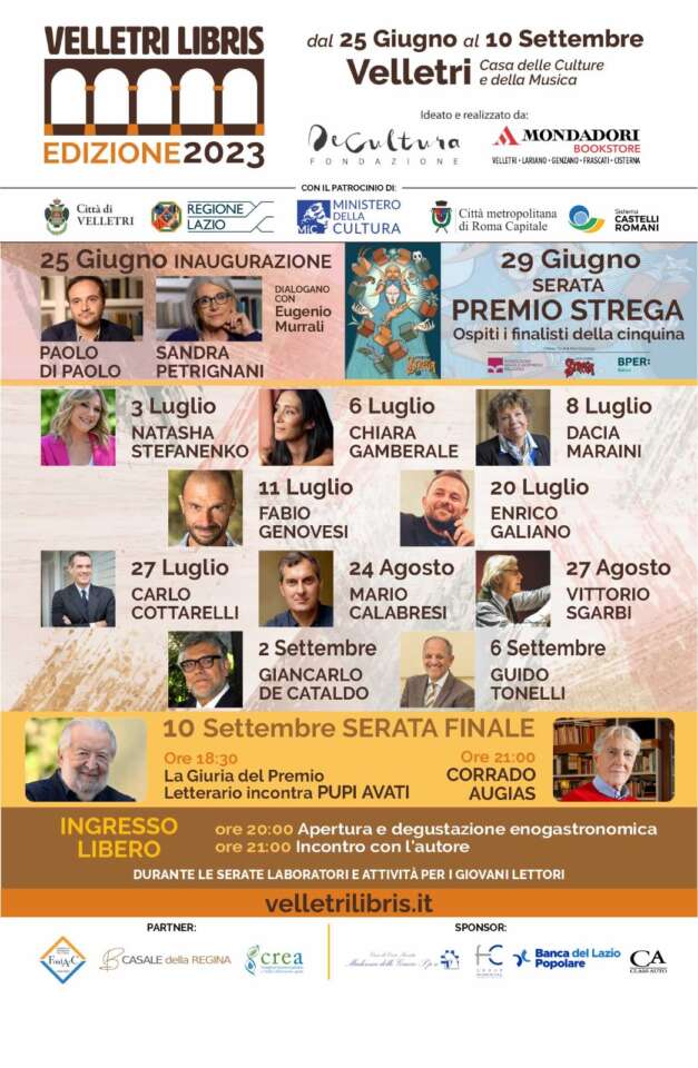 Finalmente ufficiale il programma della settima edizione della rassegna internazionale di letteratura “Velletri Libris”, organizzata dalla Fondazione De Cultura e dalla Mondadori Bookstore Velletri/Lariano/Genzano/Frascati/Cisterna e prevista con tantissimi eventi per l’estate 2023 al Chiostro della Casa delle Culture e della Musica di Velletri. Dopo la conferenza stampa in cui erano stati svelati i nomi degli autori e delle autrici ospiti, ecco il calendario completo con molte novità e altrettante sorprese.