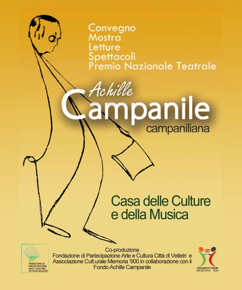 La città di Velletri che ha ospitato Achille Campanile negli ultimi anni della sua vita, a quarant’anni dalla morte del grande scrittore propone una serie di appuntamenti in una rassegna nazionale denominata “Campaniliana”. Queste, in breve, le date principali: il 21 ottobre inaugurazione della Mostra (ore 17.00) e Convegno di Studi (ore 18.00) dal titolo “Umorista sarà lei!” (Relatori: Giorgio Montefoschi, Vito Molinari, Arnaldo Colasanti, Gaetano Campanile; luogo: Casa delle Culture e della Musica di Velletri). Dal 21 al 29 ottobre Mostra fotografica-documentaria con immagini, gigantografie, manoscritti, bozzetti, disegni e oggetti di uso quotidiano dell’autore (Luogo: Casa delle Culture e della Musica di Velletri, aperta tutti i giorni dalle 10.00 alle 12.30 e dalle 16.00 alle 18.30. Curatori: Silvio Moretti, Angelo Cannatà, Gaetano Campanile). Il 24 e il 26 ottobre sono previsti Reading Campaniliani, pomeridiani e mattutini per le Scuole. Domenica 29 ottobre 2017 alle ore 18.00 presso il Teatro Artemisio Gianmaria Volonté proclamazione del vincitore del I Premio Nazionale Teatrale “Achille Campanile” (scrittura di un copione di genere umoristico) decretato dalla giuria composta da Arnaldo Colasanti (Presidente), Simona Marchini, Gaetano Campanile. A seguire rappresentazione teatrale di una commedia tratta dal repertorio campaniliano. Evento realizzato in co-produzione tra la Fondazione Arte & Cultura Città di Velletri, l’Associazione Memoria ‘900. In collaborazione con il Fondo Campanile e con il patrocinio del Comune di Velletri.