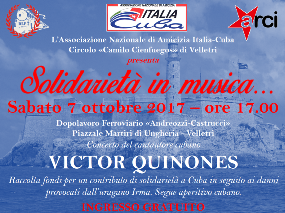 L’Associazione Nazionale di Amicizia Italia-Cuba e il circolo di Velletri “Camilo Cienfuegos” organizzano, per il prossimo sabato 7 ottobre, in collaborazione con il Dopolavoro Ferroviario “Andreozzi-Castrucci” e il circolo ARCI di Velletri, l’evento “Solidarietà in musica”. L’iniziativa, che avrà luogo nei locali del Dopolavoro di Piazzale Martiri d’Ungheria nelle adiacenze della stazione ferroviaria, è stata pensata per supportare le popolazioni latinoamericane – e nello specifico il popolo cubano – dopo i danni dell’uragano IRMA che ha duramente colpito l’America Centrale. IRMA è stato il fenomeno più devastante, per l’isola caraibica, a partire dal 1932 e ha causato dieci vittime, tre delle quali non hanno osservato le prescrizioni della Protezione Civile restando dunque nelle loro abitazioni. Normalmente gli uragani quando attraversano l’isola causano ingenti danni materiali, ma quasi mai si registrano perdite di vite umane, grazie ad un sistema di Protezione Civile efficientissimo e considerato dall’ONU uno dei migliori in assoluto indicato quale modello. Stavolta, purtroppo, non è stato così. Il circolo dell’Associazione Italia-Cuba di Velletri, in tale contesto, ha organizzato per sabato 7 ottobre alle ore 17.00 un concerto del cantautore cubano Victor Quinones, accompagnato da un banchetto di libri, oggettistica, immagini dell’isola caraibica e da un aperitivo cubano (platano fritto, moros y cristianos, sandwich cubano, ninos envueltos, ropa vieja). L’ingresso è libero, ma tutto il ricavato tra vendite e donazioni sarà devoluto per la popolazione cubana. Il circolo di Velletri si affida alla generosità dei partecipanti per raccogliere quanto più possibile e inviarlo a Cuba. Per i termini di legge in merito di trasparenza, si precisa che l’Associazione Nazionale di Amicizia Italia-Cuba informerà delle somme raccolte e inviate.