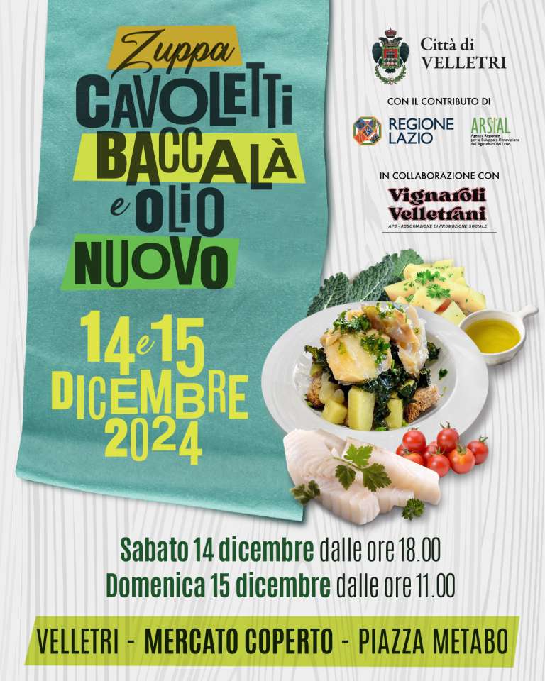 Due giorni, sabato 14 e domenica 15 dicembre, con la Sagra della Zuppa dei cavoletti e baccalà, olio nuovo e vino. La manifestazione, voluta dall’Amministrazione comunale, con il contributo dell’Arsial Regione Lazio, è programmata al Mercato coperto di piazza Metabo. A coordinare l’evento è l’assessore all’Agricoltura e alla Sovranità alimentare, Cristian Simonetti. Per l’organizzazione ci si è affidati all’associazione di promozione sociale “Vignaroli Velletrani” che, a sua volta, ha cercato di coinvolgere altre realtà associative del territorio come “’O Stazzo” e “Il Flauto magico”. Verrà adeguatamente allestito uno spazio gastronomico dove verrà preparata la zuppa di cavoletti e baccalà con cavoletti e con olio novello prodotti del territorio, accompagnati da vino locale. Un piatto genuino a prezzo popolare. Inoltre, presso lo spazio gastronomico, saranno servite anche specialità gastronomiche alternative. Nel contesto della Festa, all’esterno del Mercato coperto, verrà allestito un braciere per la cottura delle caldarroste che verranno poi distribuite ai visitatori. Nel contesto della manifestazione sarà proposto un percorso didattico-fotografico descrittivo dei passaggi che dalla raccolta delle olive portano alla produzione dell’olio. Troverà poi spazio attività di animazione popolare con suonatori di fisarmoniche, organetti, tamburelli, cantori e danzatori in abito popolare gruppi folk veliterni e territoriali, che animeranno le due giornate fra stornelli, saltarelli, quadriglie e danze da piazza. Coinvolti anche i Musei Civici per far conoscere la storia e le ricchezze archeologiche della nostra città. È stato pensato di inserire nel contesto della manifestazione, in entrambi i giorni, anche un Tour con visite guidate presso alcune cantine del territorio che hanno dato la disponibilità.