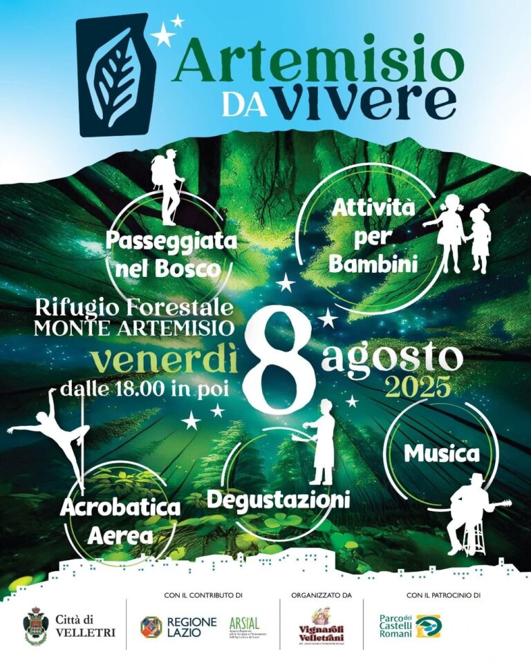 La città di Velletri si prepara a vivere una serata speciale all’insegna della natura, del benessere e delle tradizioni locali. Venerdì 8 agosto, a partire dalle ore 18, il Rifugio Forestale del Monte Artemisio sarà il cuore pulsante dell’evento “Artemisio da Vivere”, organizzato dall’Associazione Vignaroli Velletrani APS con il contributo del Comune di Velletri, della Regione Lazio e di Arsial, e il sostegno di numerose aziende del territorio.