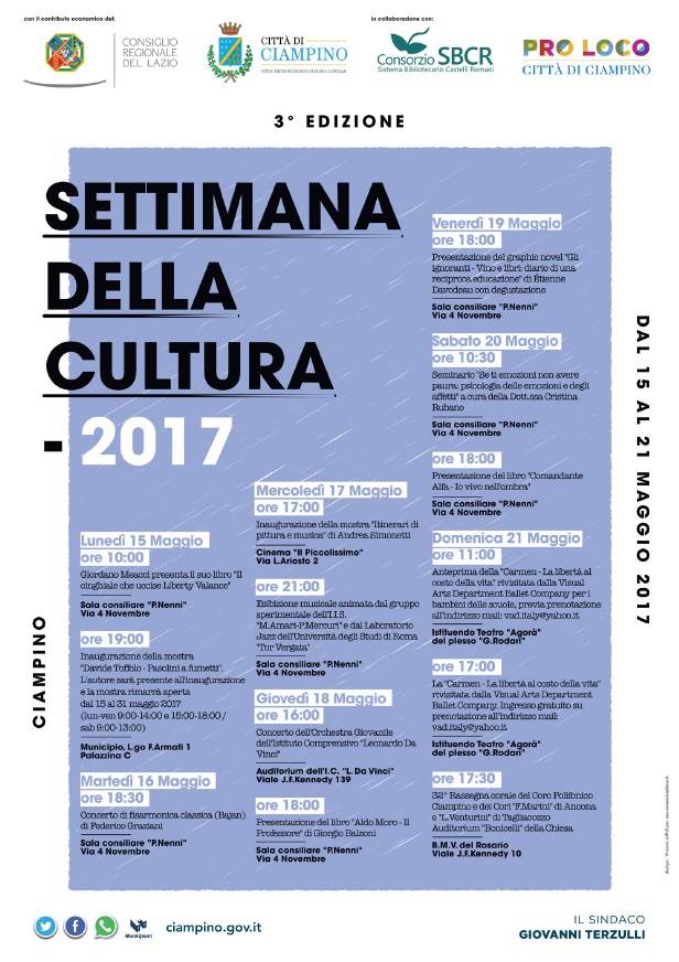 Giordano Meacci e Davide Toffolo, gli illustri padrini di apertura di questa terza edizione della “Settimana della Cultura” a Ciampino, ricca di appuntamenti ed iniziative culturali organizzate dal Comune di Ciampino, Assessorato alla Cultura, con il contributo economico del Consiglio Regionale del Lazio, in collaborazione con il Sistema Bibliotecario dei Castelli Romani, la Pro Loco e l’Archivio P.P. Pasolini di Ciampino, e con il supporto di associazioni e scuole del territorio, al fine di promuovere l’arte, la danza, la musica, la letteratura, ed i cittadini di eccellenza legati con la Città. Lunedì 15 maggio alle ore 10, infatti, lo scrittore sceneggiatore saggista Meacci, Premio Città di Ciampino 2016, incontrerà gli studenti degli istituti superiori del territorio presso la Sala Consiliare “P. Nenni” per parlare di cinema, di letteratura e di Ciampino. Alle ore 19, sarà la volta del musicista e produttore Toffolo, che inaugurerà presso la sede comunale l’esposizione originale dedicata al suo libro “Pasolini” e presentato in forma di installazione in una mostra, “Davide Toffolo, Pasolini a fumetti”, curata dall’Associazione Viva Comix in sinergia con il Centro Studi Pasolini di Casarsa, che resterà visitabile fino al 31 maggio. Per l’occasione, l’Amministrazione comunale celebrerà, attraverso le istantanee inedite di Ciampino esposte lungo i corridoi del Comune e risalenti agli inizi del secolo scorso, quel forte legame tra la figura di Pier Paolo Pasolini e la Città, in un percorso storico fotografico che ricorda com’era la borgata, stretta tra Marino e la periferia romana, prima di diventare Comune autonomo nel 1974 e di acquisire nel 2004 il titolo di Città. La settimana sarà inoltre arricchita da altre iniziative che riempiranno la Sala consiliare “P. Nenni”: martedì 16 maggio alle ore 18.30 si esibirà il giovane concittadino Federico Graziani in un concerto di fisarmonica classica; mercoledì 17 alle ore 21 si terrà l’esibizione musicale animata dagli studenti del gruppo sperimentale dell’I.I.S. “M. Amari – P. Mercuri” e dal Laboratorio Jazz dell’Università degli Studi di Roma “Tor Vergata”; giovedì 18 alle ore 18 Giorgio Balzoni presenterà il suo libro “Aldo Moro – Il Professore”; sabato 20 doppio appuntamento: la mattina alle 10.30 la Dott.ssa Cristina Rubano presenta il seminario “Se ti emozioni non avere paura: psicologia delle emozioni e degli affetti”; alle ore 18 invece si terrà la presentazione del libro “Comandante Alfa – Io vivo nell’ombra”. Il Cinema “Il Piccolissimo” ospiterà la mostra “Itinerari di pittura e musica” di Andrea Simonetti che sarà inaugurata mercoledì 17 maggio alle 17; presso l’Auditorium dell’I.C. “Leonardo Da Vinci” giovedì 18 alle ore 16 si terrà il concerto dell’Orchestra Giovanile dell’istituto; la Visual Arts Department Ballet Company domenica 21 maggio alle 17 porterà sul palco dell’Istituendo Teatro “Agorà” presso la scuola “G. Rodari” la rivisitazione della “Carmen – La libertà al costo della vita” (prenotazione all’indirizzo mail: vad.italy@yahoo.it). A chiudere l’intera manifestazione culturale, domenica 21 alle 17.30 sarà la 32° rassegna corale del Coro Polifonico Ciampino e dei Cori “F. Marini” di Ancona e “L. Venturini” di Tagliacozzo. “Ciampino si è sempre caratterizzata per la presenza di cittadini che sono riusciti con il loro impegno, la loro passione, le loro doti, a darle lustro e questa terza edizione della Settimana della Cultura ne è un piccolo esempio.” È quanto ha dichiarato il Sindaco di Ciampino,Giovanni Terzulli. “Dallo scrittore Meacci al musicista Graziani, dall’artista Simonetti ai danzatori della VAD, dai gruppi musicali delle scuole al coro polifonico, sono tante le realtà territoriali che contribuiscono ogni giorno ad impreziosire la nostra Città. Quest’anno, poi, il Comune di Ciampino ospiterà dal 15 al 31 maggio una esposizione dedicata al libro di Davide Toffolo ‘Pasolini’ che ripercorre le tappe della storia del grande intellettuale italiano, così come li ha descritti Toffolo, uno degli autori più interessanti della scena del fumetto d’autore che sarà qui a Ciampino, nel nostro comune, lunedì 15 maggio alle 19 per inaugurare la mostra. Invito la cittadinanza a partecipare numerosa”.