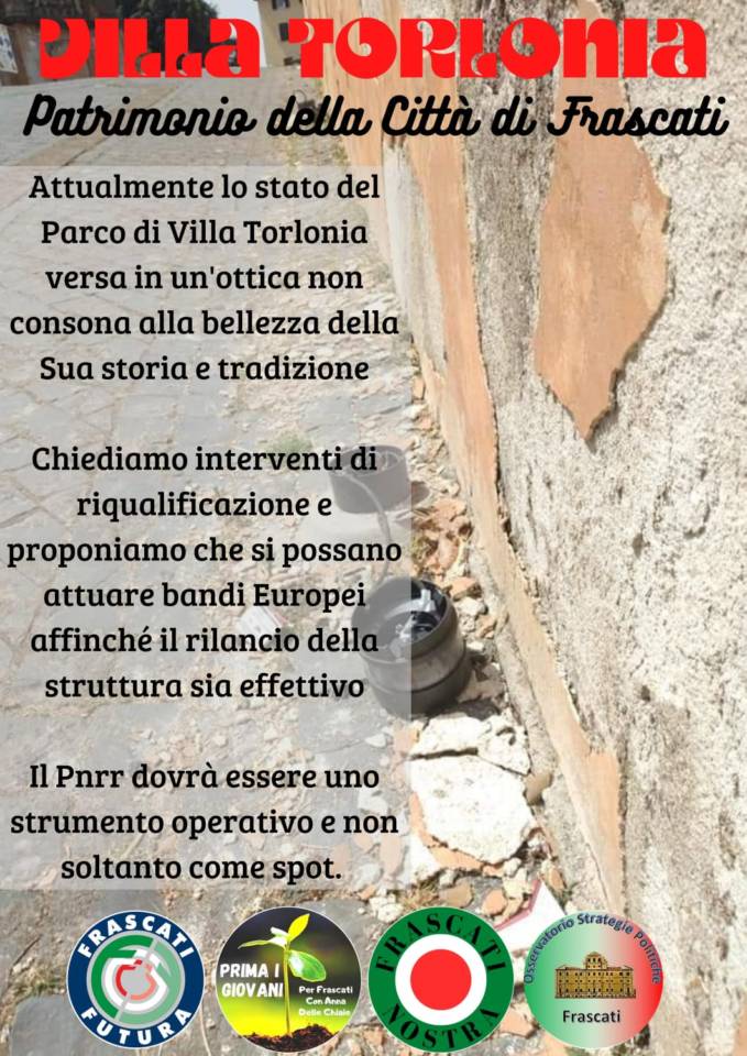 “Attualmente lo stato del Parco di Villa Torlonia versa in un’ottica non consona alla bellezza della Sua storia e tradizione”. Lo scrivono Frascati Futura, Prima i Giovani, Frascati Nostra e Osservatorio Strategie Politiche Frascati.