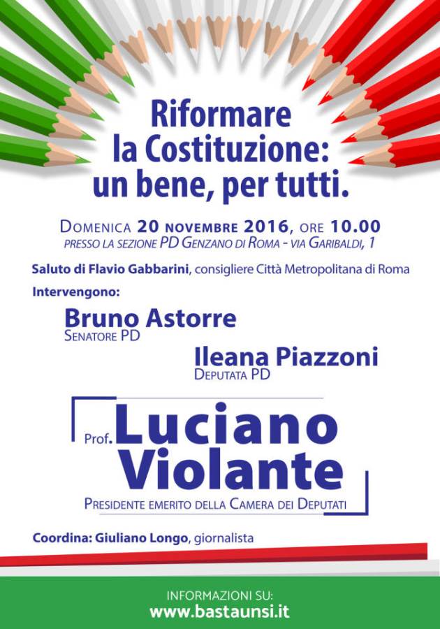 Dopo il successo di partecipazione di ieri sera (sabato 19 novembre 2016 ndr) a Monte Compatri con il Presidente della Regione Lazio, Nicola Zingaretti, tra poche ore a Genzano (ore 10.00, sezione Pd, Via Garibaldi 1), si terrà l’incontro con il Presidente emerito della Camera dei Deputati, Luciano Violante; il Senatore Bruno Astorre e la Deputata Ileana Piazzoni. Porterà i suoi saluti il consigliere della Città Metropolitana di Roma, Flavio Gabbarini. Modererà il giornalista Giuliano Longo. Il tema dell’incontro è “Riformare la Costituzione: un bene, per tutti”.