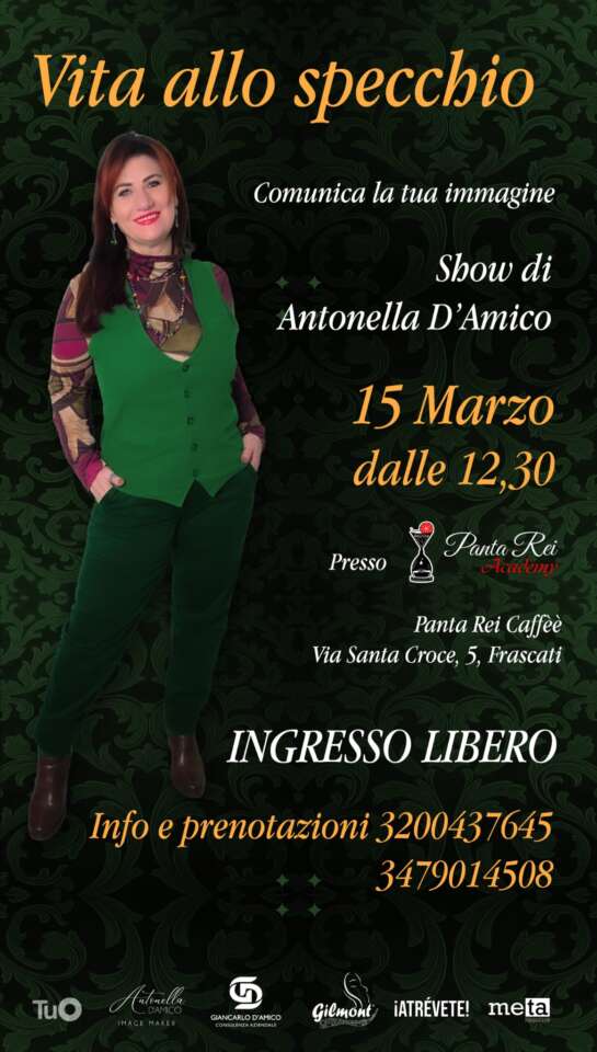 Domenica 15 marzo alle ore 12:30 si terrà a Frascati un nuovo appuntamento con “Vita allo Specchio”, il live show ideato e condotto da Antonella D’Amico. Il collaudato format si rinnova, prima di tutto nella location. Sarà infatti il Panta Rei Caffè di Frascati a far da cornice alle performance proposte, con gli apprezzatissimi test attitudinali su look e colori da indossare, unitamente a consigli utili e tecniche di comunicazione non verbale, per presentarsi sempre al meglio in ogni occasione, dagli ambiti professionali al tempo libero, ma soprattutto per stare bene con se stessi, accettando la propria identità, valorizzandone caratteristiche e peculiarità.