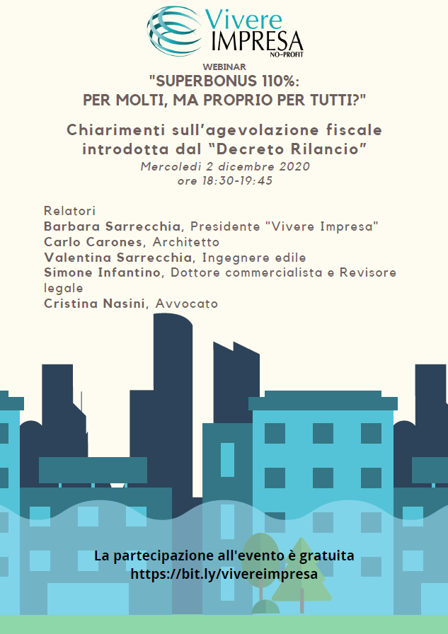 Si svolgerà mercoledì 2 dicembre dalle ore 18:30 alle 19:45 il webinar “Superbonus 110%: per molti, ma proprio per tutti?”, organizzato dall’associazione Vivere Impresa No-Profit sulla piattaforma Zoom al seguente link https://bit.ly/vivereimpresa.
