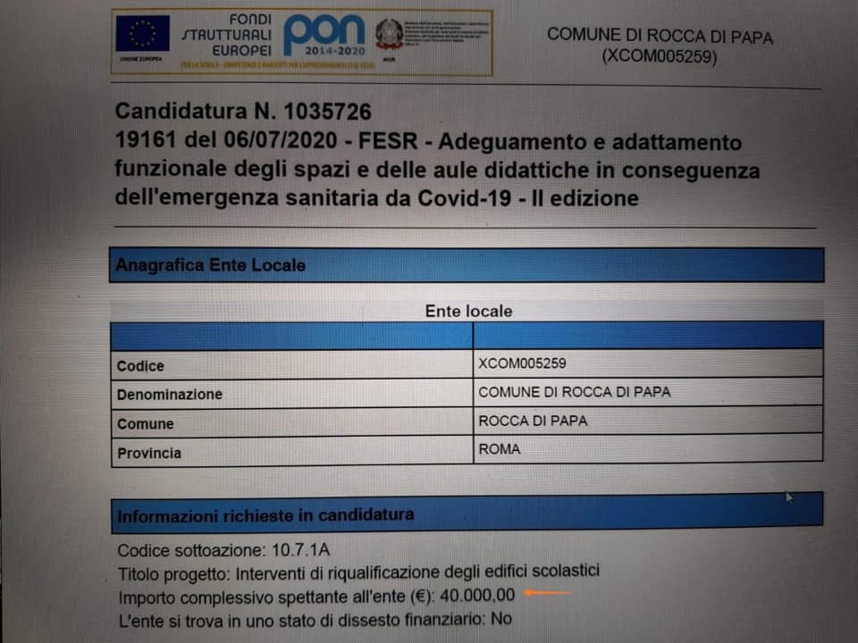 Sul tema scuole, infatti, l’aspirante sindaco Croce ha asserito che il comune di Rocca di Papa non ha presentato richiesta di finanziamento al ministero dell’istruzione per gli interventi di riqualificazione degli edifici scolastici ma, come da foto che alleghiamo, la richiesta è stata inoltrata dal comune in data 6 Luglio 2020!! Informarsi prima di parlare è doveroso!