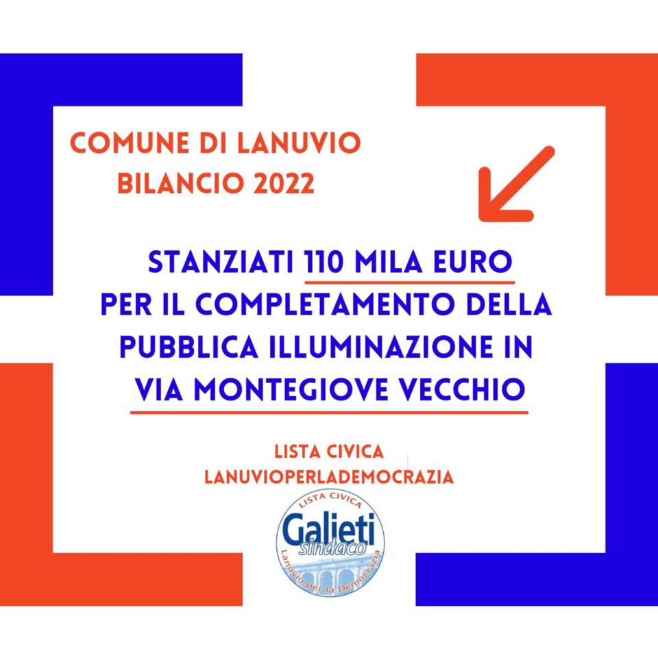 L’amministrazione comunale di Lanuvio,nell’ambito dell’approvazione del bilancio di previsione 2022 ha stanziato 110.000 euro per il completamento dell’illuminazione pubblica in via di Monte Giove vecchio.
