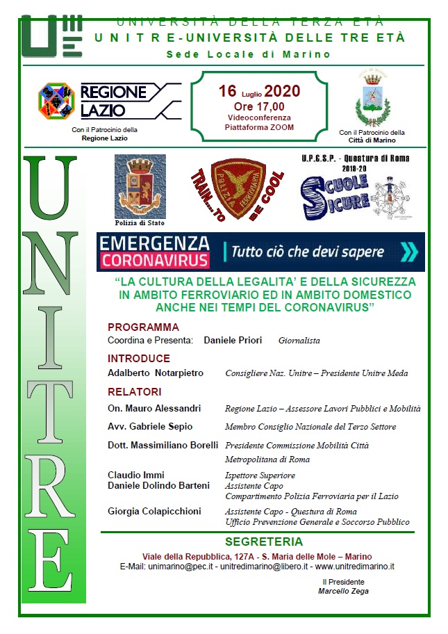 Marino. Unitre – Università della Terza Età – insieme alla Polizia di Stato, Polfer e Scuole Sicure. Videoconferenza su piattaforma Zoom con tema “Legalità e Sicurezza”.