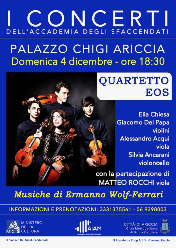 Domenica 4 dicembre, alle ore 18:30, nella Sala Maestra del Palazzo Chigi di Ariccia, il Quartetto Eos – Elia Chiesa e Giacomo Del Papa violini, Alessandro Acqui viola, Silvia Ancarani violoncello – insieme al violista Matteo Rocchi saranno protagonisti del concerto in cui verrà presentato al pubblico degli “Sfaccendati” il Quintetto con due viole di Ermanno Wolf-Ferrari.