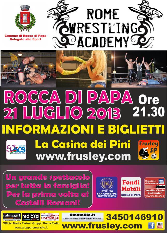 Maschere, mosse proibite, sedie spaccate sulla schiena, cazzotti a bordo ring: lo show del wrestling, tra arti marziali e spettacolo, arriva a Rocca di Papa (RM) e per la prima volta ai Castelli Romani. Il 21 Luglio dalle ore 21.30 nella Piazza della Funicolare già teatro di altri eventi estivi scendono a dar spettacolo gli atleti della Rome Wrestling Accademy. Per gli appassionati, un’occasione di assistere dal vivo allo show che spopola in America e ha fatto proseliti anche in Europa grazie alla tv. Un’esibizione-spettacolo, in cui alcuni dei wrestler più famosi porteranno in scena i loro colpi e i loro personaggi Sì, perché di tali si tratta, e non è un caso che molti di questi atleti abbiano in curriculum anche la professione di attori. Uno spettacolo per tutta la famiglia consapevole che si tratterà di uno show e non di un evento sportivo dove i più piccolini verranno coinvolti in gag e giochi con i protagonisti! La manifestazione è organizzata dalla Frusley Sp e dal delegato allo Sport del Comune di Rocca di Papa con il supporto della AICS Roma. I protagonisti della Rome Wrestling Accademy aderisce al circuito European Pro Wrestling e prima di arrivare nella ridente città dei Castelli Romani saranno presenti il giorno 07 Luglio al porto Turistico di Roma!