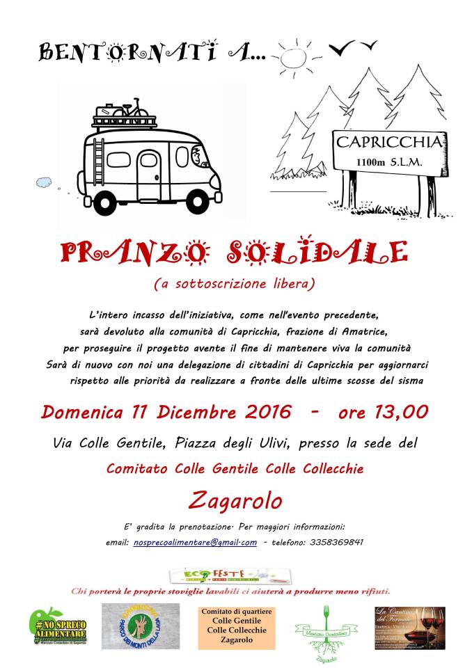 Dopo la splendida riuscita dell’iniziativa del 16 ottobre, il comitato spontaneo No Spreco Alimentare di Zagarolo, in collaborazione con il Comitato di quartiere Colle Gentile Colle Collecchie e con il Mercato Contadino di Zagarolo, prosegue l’impegno e la solidarietà nei confronti di Capricchia, piccola frazione di Amatrice, con un altro pranzo solidale previsto per domenica 11 dicembre presso la sede del comitato Colle Gentile – inizia così la nota. Anche in questa occasione, l’intero incasso sarà consegnato direttamente ad una rappresentanza di cittadini presenti al pranzo e ormai divenuti nostri amici, che ci aggiornerà rispetto alle priorità da realizzare, anche a fronte delle ultime scosse sismiche.
