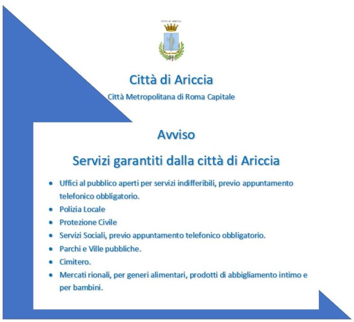 Nel rispetto del Decreto Legge che ha disposto la Regione Lazio in Zona Rossa , il Comune di Ariccia garantisce alla Cittadinanza i seguenti servizi: